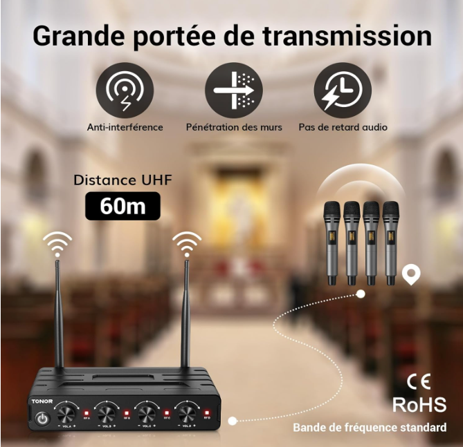 Grande portée sans fil : Profitez de la liberté du sans-fil grâce à notre récepteur qui a une portée de 200 pieds/60 mètres. Déplacez-vous sans effort pendant les spectacles, parfaits pour le karaoké, les rassemblements d'église, les mariages, les réunions ou les conférences. Faites l'expérience de présentations sans restriction et sans interruption, à l'intérieur comme à l'extérieur.